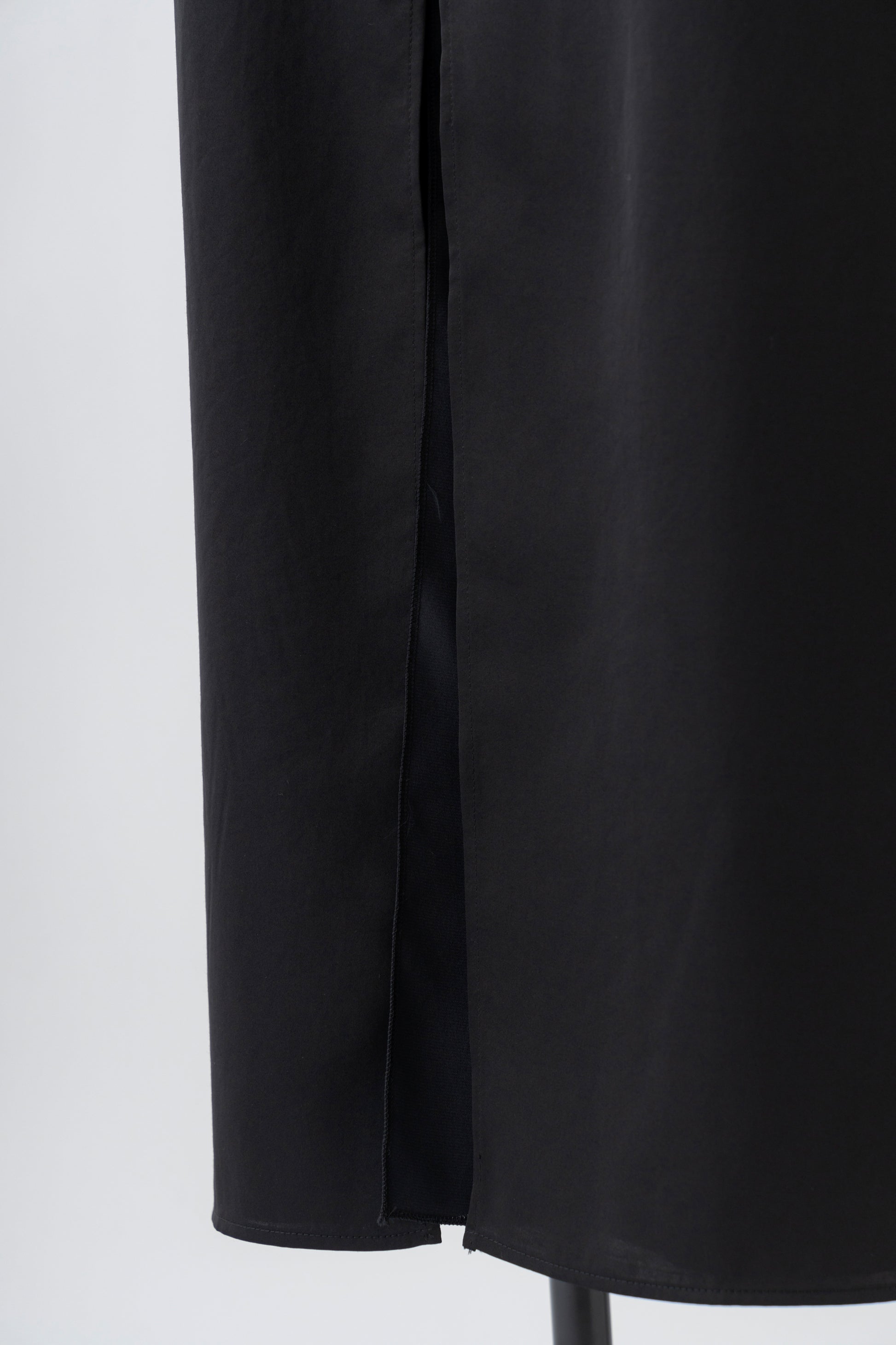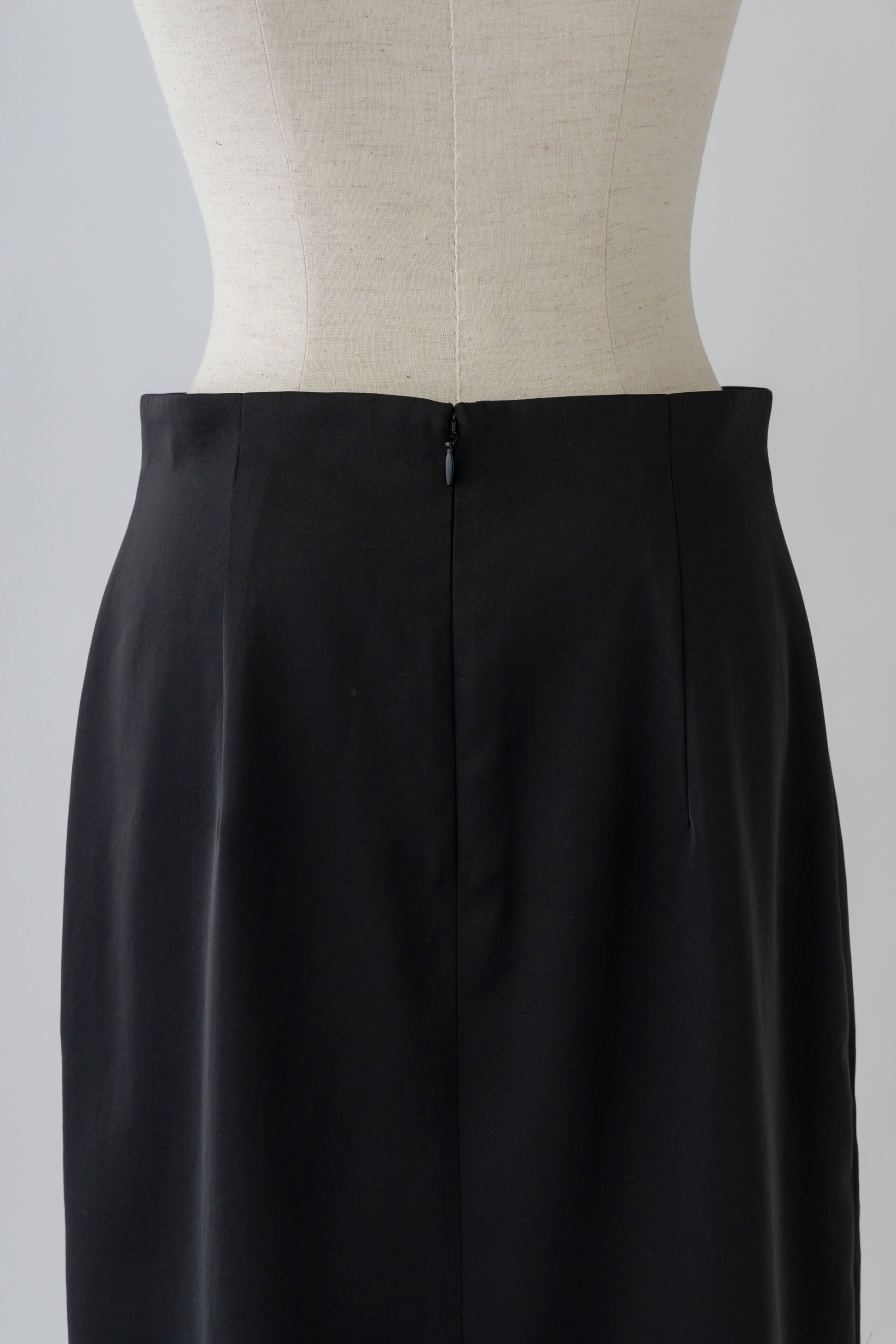 スッキリとしたシルエットで裏地にもサテンを仕様し、後ろスリット部分は裏のサテン生地も表同様にスリットを入れて2枚仕立てのデザインにしています。