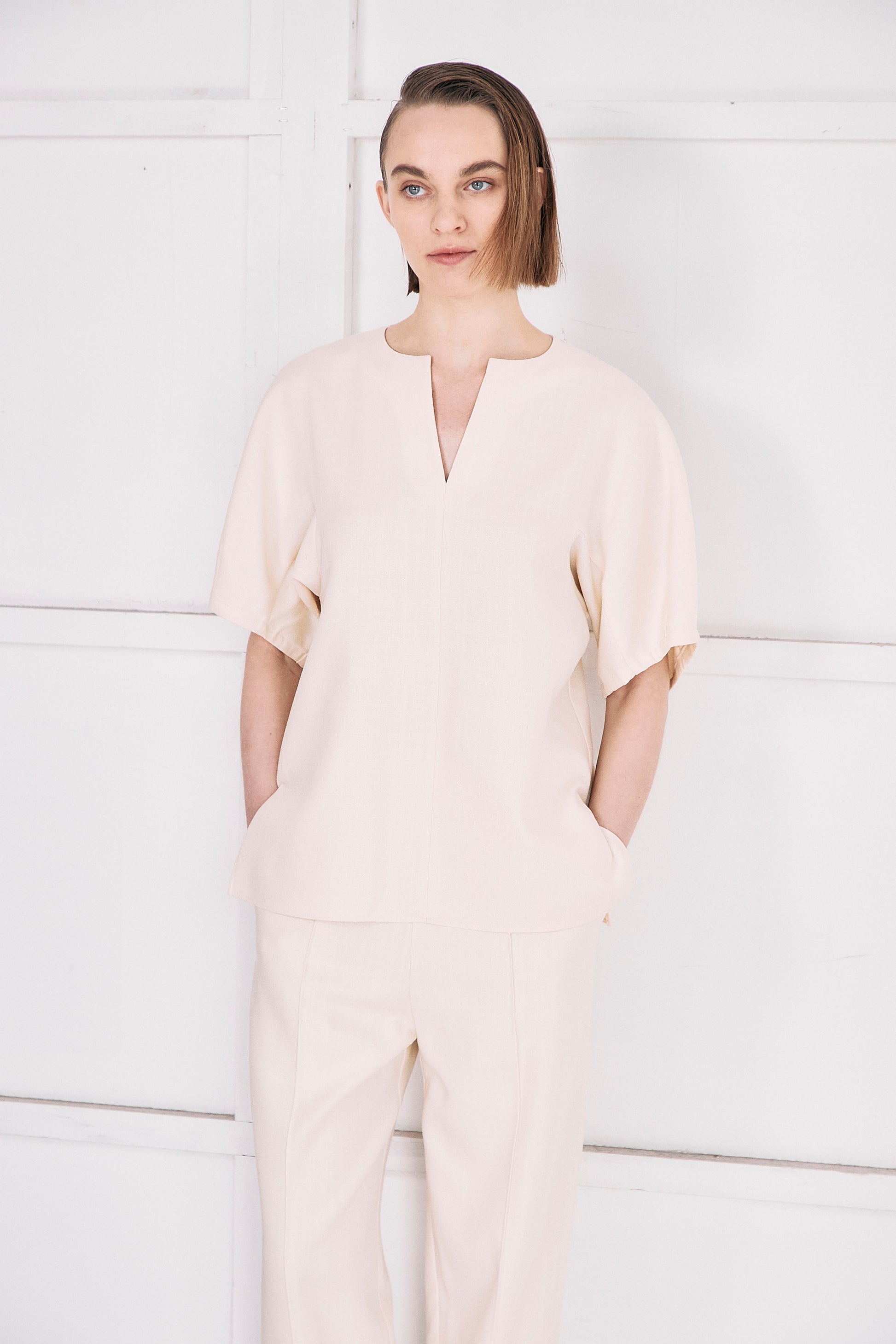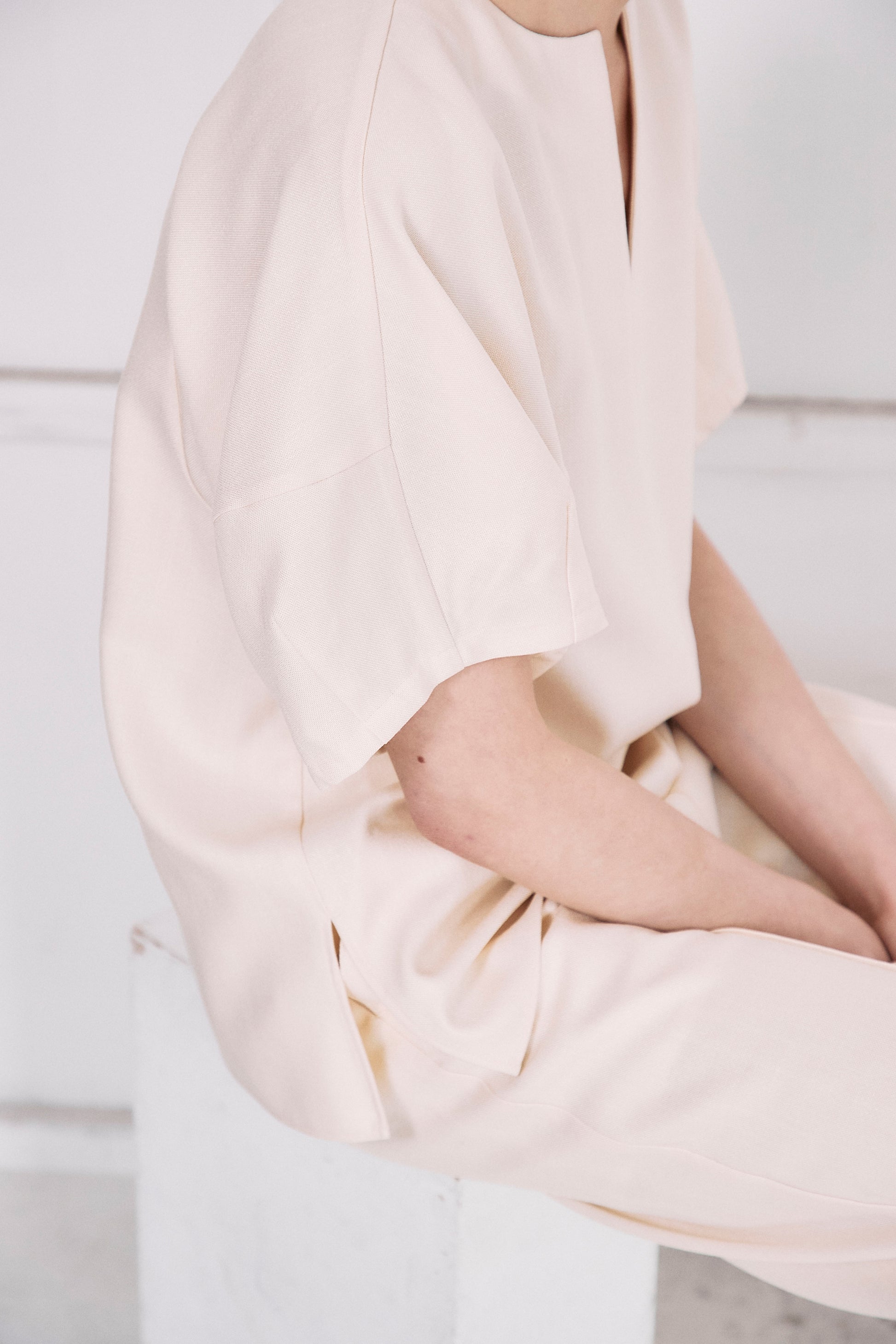 体のラインを拾わないリラックスシルエットですが、艶のあるエレガントな素材感をセレクトすることで、上質感のある夏のブラウスに仕上がっています。